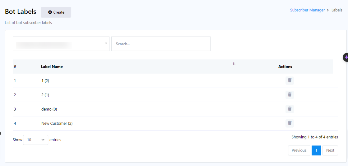 Labels are used to segment subscribers list with a tag. To manage labels, click on the `Manage Labels` field in the Subscriber Manager. From here, creating new labels and deleting any existing labels are done.